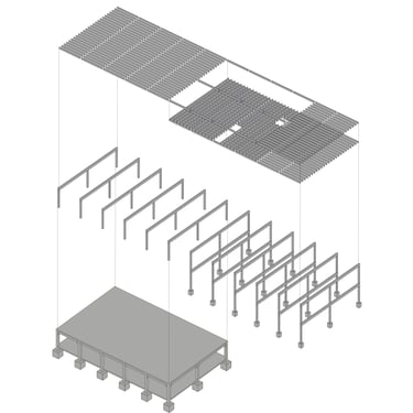Im Bestandsgebäude ist leider nicht mehr als das alte Stahlbetonskelett erhaltenswert. Deshalb wurden für diesen Entwurf die Maße des Skelettes aufgenommen und entlang der baulichen Achse in Richtung Osten durch einen Holzskelettbau erweitert, dadruch entseht eine interessante qualitativ bespielbare Struktur. Durch eine weitere nördliche Achse zum Rhein wurde das Raster durchbrochen, um Raum für Aufenthalts- und Erschließungsflächen zu schaffen.